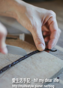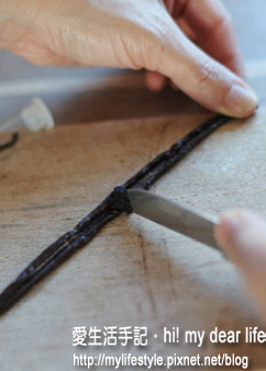 3、把新鮮香草莢切開,刮下香草籽,加入鍋中,均勻攪拌。
