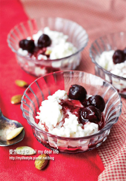 水300cc、白米180g、鮮奶1000cc、鮮奶油250cc、杏仁100g、糖4湯匙、香草粉1 茶匙、櫻桃醬(要吃前加溫一下)