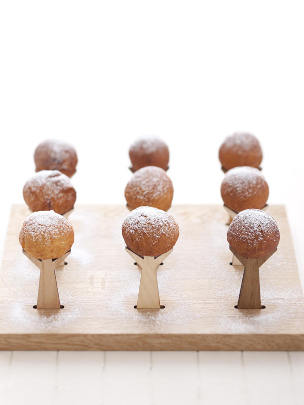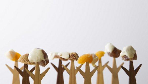 叉子的造型簡單到不行,僅有上窄下寬的握柄與三叉形的尖端,看起來就像小朋友常畫的「樹木」,只是少了上頭的葉子。其實設計師想要呈現正是這樣的畫面,他們讓小點心取代茂密的樹葉,不需要額外的盤子來妝點食物,只需要將叉子們排排站就很有感覺,彷彿進入甜點森林一樣。