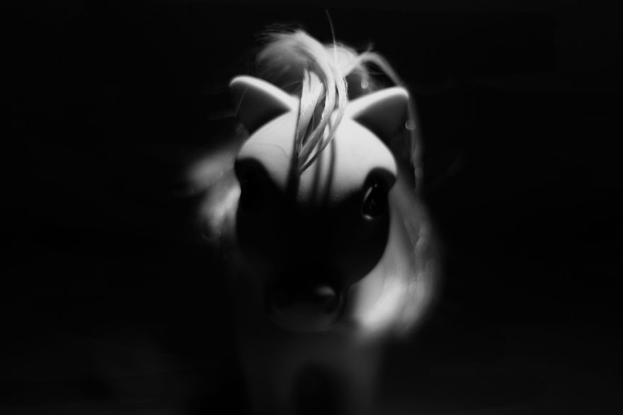 打光是一門學問,尤其人像照來說,角度抓得好就能拍出相當立體的輪廓,除非特殊需求,不然很少有人會用這麼戲劇性的方式打光,Brian Kos 專挑看起來很陽光正面的卡通玩偶,以陰影+角度儘可能展現出玩具們的黑暗面,就算是最無害的彩虹小馬也變成心懷不軌的暗黑小馬,氣氛拿捏得相當成功,有些根本可以直接拿來當鬼片的宣傳海報了,雖然這樣崩壞人們的童年卡通角色有些不可取,但如果你很喜歡他的風格,也是可以到 Flickr 去追蹤 Brian Kos,大半夜一個人窩在電腦前看他的作品,應該會特別有感喔~~