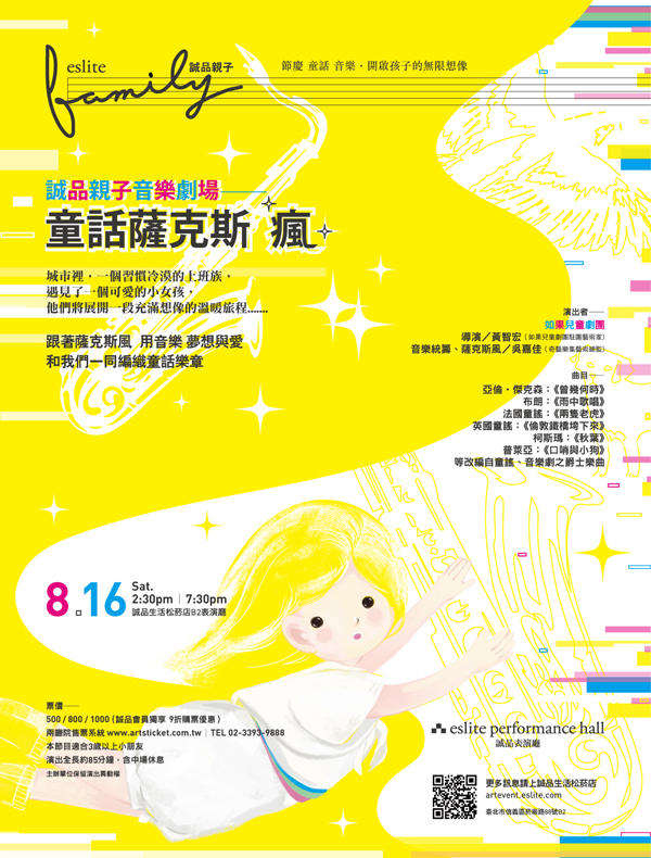 誠品表演廳八月親子音樂劇場,為孩子推出《童話薩克斯「瘋」》節目,透過戲劇、音樂與童話故事的結合,為暑期活動新增文化與創意,開啟孩子無限想像。此次誠品音樂劇場描述一個從薩克斯風發想的原創故事,透過如果兒童劇團的戲劇演出,讓大小朋友隨著薩克斯風,用音樂、夢想、與愛,一同編織出童話樂章,讓今年的暑假,刻印一場不同以往的親子周末時光。活動於8月16日(六)演出兩場,邀請大小朋友來到誠品表演廳,一同感受充滿想像的溫暖旅程,活動即日起兩廳院售票系統熱烈搶購。詳情請洽 artevent.eslite.com