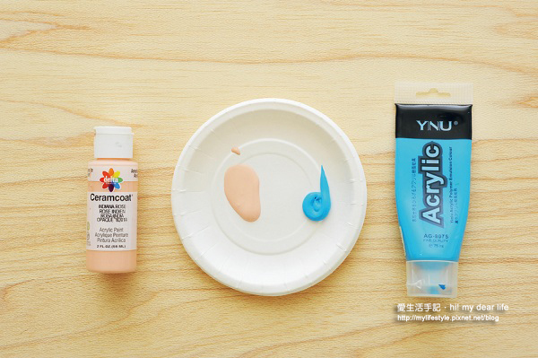 左側是木器彩繪用壓克力顏料,右側為一般壓克力顏料。一般壓克力顏料含膠量較多,拓印完成後,會使拓印圖稿容易有硬塊;而木器彩繪顏料因質地較稀,可以拓得很薄,較不影響拓印完成後的觸感。
