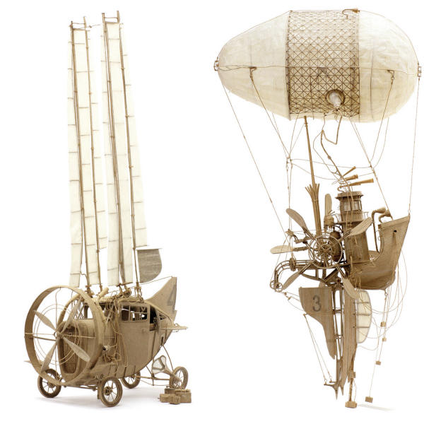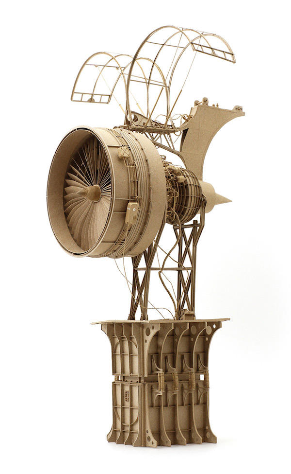 對藝術家 Daniel Agda 來說,這兩句話或許正是他創作的寫照,畢竟不是每個人都能具備機械相關的天份,所以他選擇用自己最擅長的方式來實踐幻想。相當具有現代感的巨大渦輪推進器,配上復古的駕駛座與機翼,下方似乎還以鋼筋來固定大型的貨櫃,充滿奇幻想像的飛行器全都是藝術家利用紙板所做成,細膩程度完全不輸真實的飛行器。