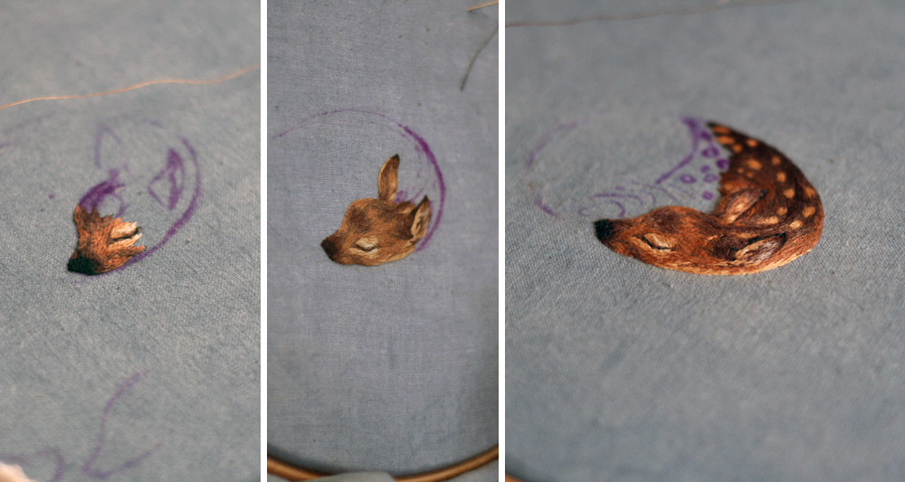 這些刺繡作品最有趣的特色在於每隻動物的尺寸都超迷你,跟針線工具頂針差不了多少,雖然體積不大,但是動物們的毛色細節卻都相當講究,關鍵的毛向性也拿捏得很準,讓這些小動物相當活靈活現,沒有受到尺寸影響。