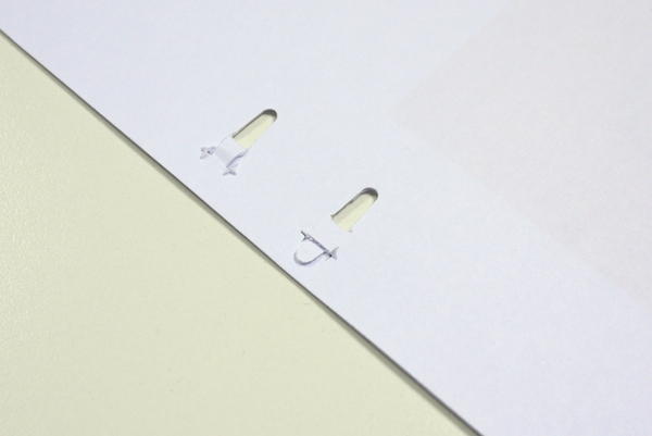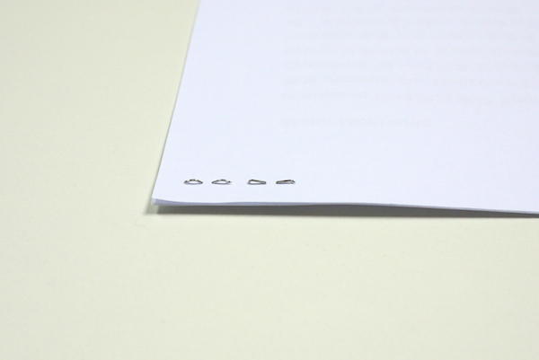 這就是傳說中無針釘書機的所釘出的效果,大編特地以一正(左上)一反(右下)的狀態讓大家看。簡單來說就是把紙張裁出一小片長條狀的紙片,並且將它向後推進同時裁切出的細縫中,達到以紙張固定紙張作用。