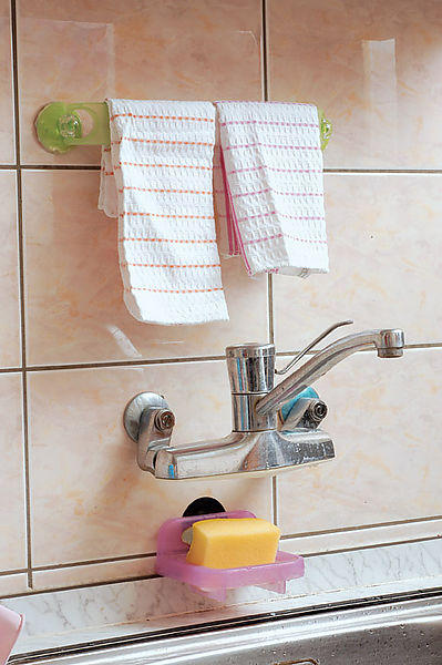 抹布清洗之後最怕的就是沒放在通風處晾乾,不只容易發臭也容易造成細菌的滋生,因此可利用毛巾架固定在牆面上來掛取抹布,既通風又方便收納。