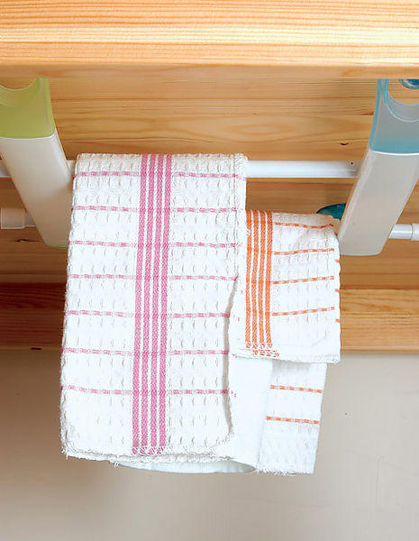 將兩個毛巾架平行固定在廚房壁櫃下方,架上兩個伸縮桿,就能多掛上好幾條抹布。