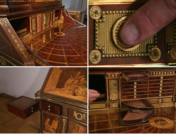 像是這張出自於David Roentgen之手的古董書桌Berling Cabinet,由普魯士國王 Fredrick William II 所擁有,華麗的裝飾、精密的機械設計,以及巨大的尺寸,宣告著皇家級的設計,自然是皇家所擁有。書桌頂端的報時時鐘,搭配鑲嵌工藝所做成的櫃面,本來就已經夠吸睛,殊不知在許多不為人知的地方,隱藏著不起眼的鑰匙孔,以及巧妙融入外觀裝飾的按鈕,按下後,打開的不只是隱藏的抽屜、秘密的隔間,還有人們的眼界和想像力。