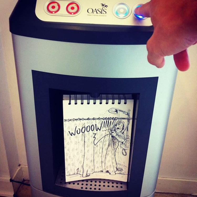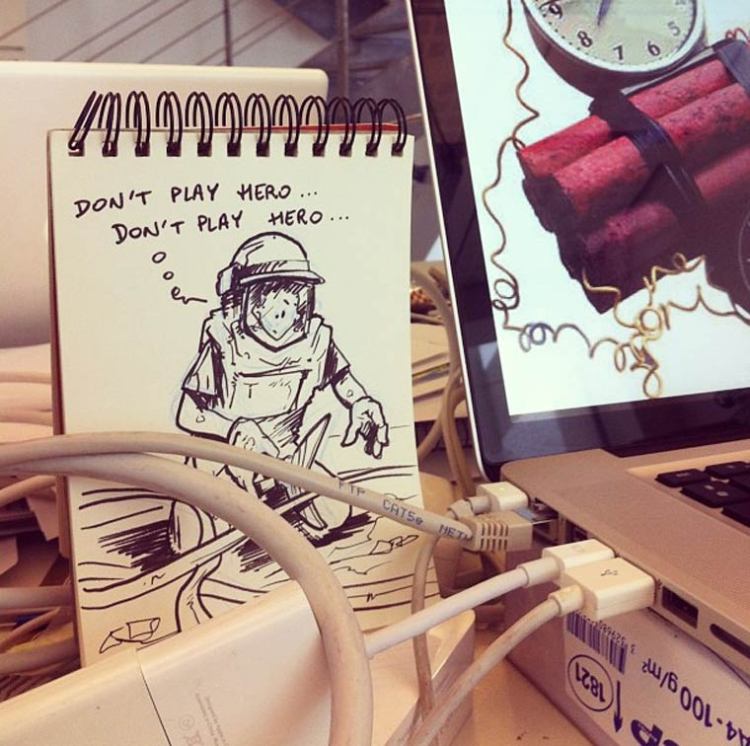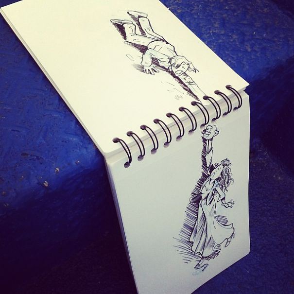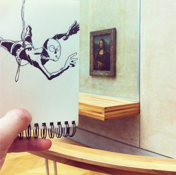這一系列「Cartoonbombing」的作品,便是 David Troquier 用紙張與畫筆,賦予生活中那些習以為常,甚至不以為意的事物、環境一個新的觀看角度。他用如卡通般出奇不意的思維與人物,去和真實環境互動。看著一個有麵包屑的餐盤,你會想到什麼?David 畫了一個在用吸塵器打掃的媽媽 ; 看到一檯轉動的電風扇,David 畫了一個人在強風下,傘都被吹花了。那些在我們生活當中幾乎已經融為一體,也極為平凡的時刻或情境,在David筆下,同時成了畫裡「Cartoon」 人物生活的一部份。