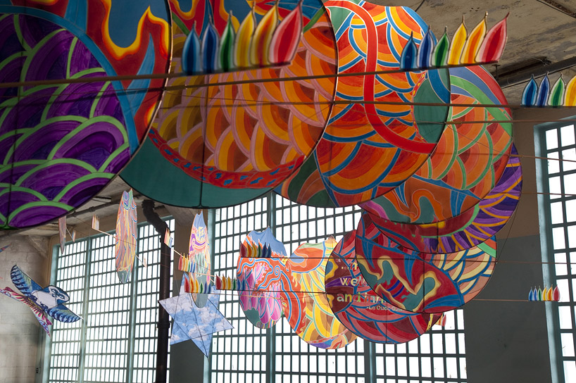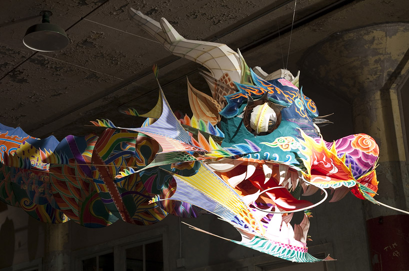 【With Wind】以中國傳統的龍做成風箏,本應在戶外翱翔的風箏只能在室內盤旋,象徵著失去自由的靈魂。