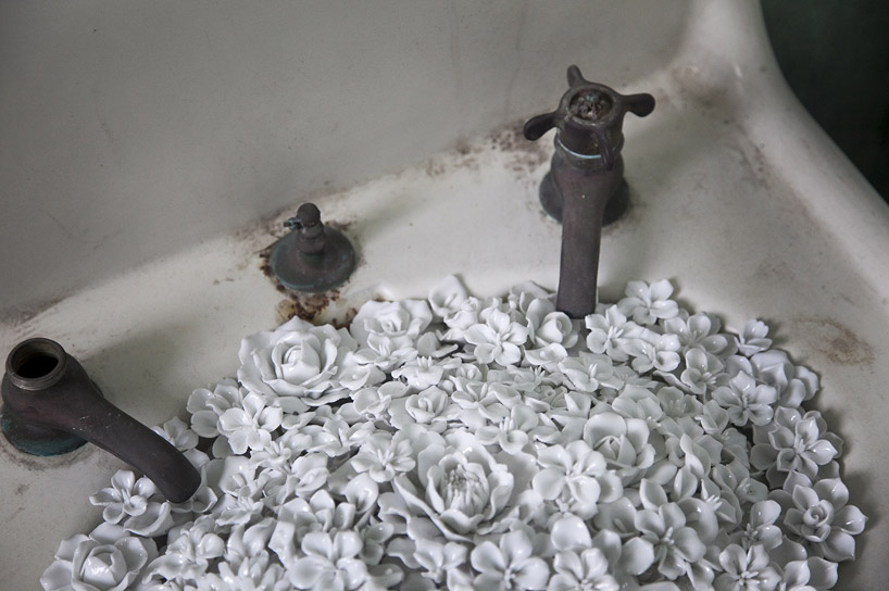 【Blossom】在髒亂破舊的廁所中塞滿陶瓷花朵,藉以諷刺 1956 年中國百花運動所提倡的百花齊放。