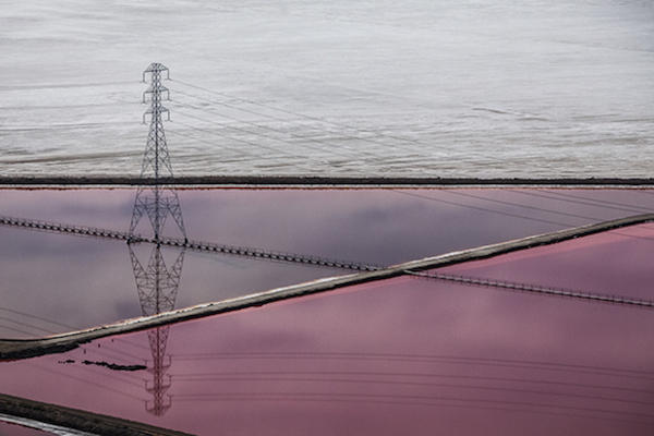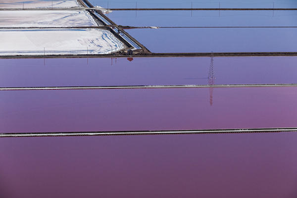 天上的白雲與藍天,地上的電塔與河水,搭配已結晶的雪白海鹽,每個元素都為素淨的紫色鹽湖點綴加分,夢幻程度持續向上飆升。不過如同剛才所提到的,這些鹽湖是人造形成,其目的不是為了提供攝影師拍照,而是為了產出工業用鹽,只是在無意之間造就了這個美麗的景色。