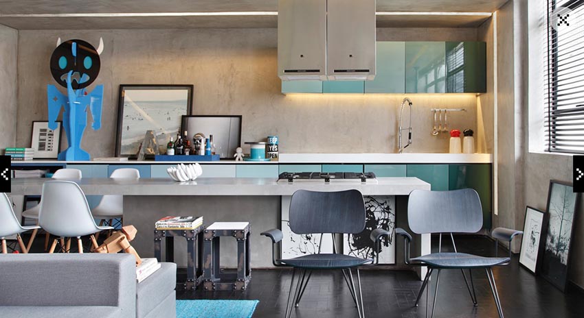 對於水泥的質感無法抗拒嗎?來看巴西設計公司 Studio Guilherme Torres 如何與鮮豔的色彩進行混搭吧!客廳從牆面延伸到天花板,都是用水泥粉光,營造一股輕工業風格。而通常會在天花板做的間接照明,也延伸到整個牆面,替冰冷的水泥增添溫暖的感覺。而開放式的廚房,中島與餐桌連成一氣,搭配不同款式與顏色的椅子,與彩度高的收納門板,讓空間顯得趣味十足。喜歡水泥質感,又怕居家太過冰冷,利用顏色就能輕易讓空間增溫喔!