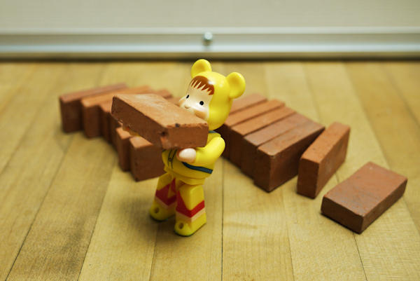 其實編輯是個很沒創意的人,遲遲無法決定這人生的第一間屋究竟要怎麼蓋,所以很孬種的不動用水泥,只先拿磚頭隨意試拼過過乾癮,還找來一些公仔幫助刺激靈感,看看可愛的幾米版庫柏力克熊,認真搬磚的樣子好萌喔~~