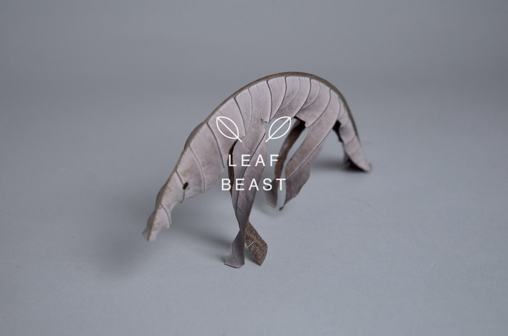 以乾枯的玉蘭花葉為材料,輕輕地雕出動物的輪廓,由於失去水分的葉片相當易碎,一不小心就會折損脆化,所以每片雕塑都得被小心奕奕地對待,跟現實中粗曠強壯的荒野猛獸相比真是天差地遠!