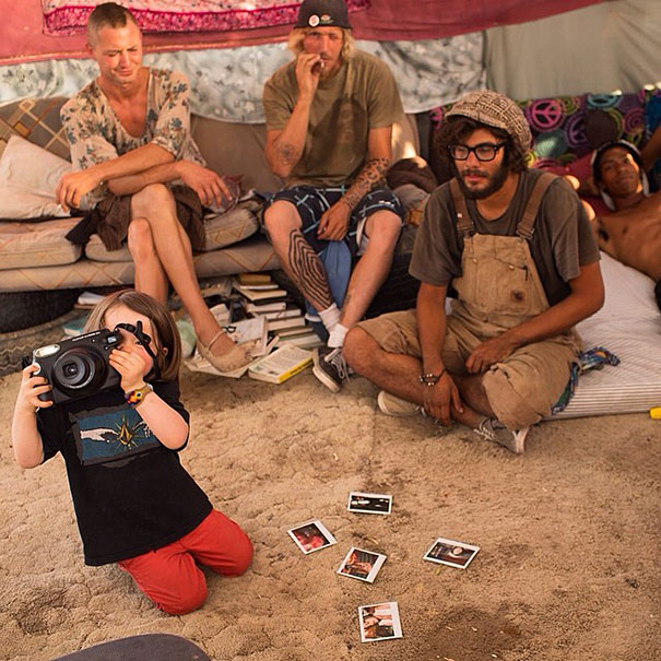 知名國家地理雜誌攝影師 Aaron Huey 約在六個月前帶著小小鷹眼到美國西部旅行,並交給他一台 Fujifilm Instax 210,鼓勵他透過攝影主動觀察一路上接觸到的人事物,殊不知這樣拍著拍著倒也真的勾起小朋友對攝影的興趣,也意外發現這孩子還真是一點都不怕生,小小人兒揹著一台比臉大的相機到處東拍西拍,不只他自己玩得開心,也成為這趟旅行中最大的亮點。