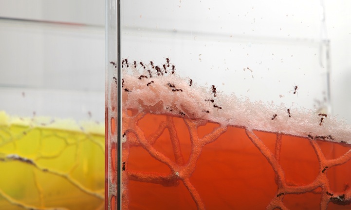 Troemel以勤奮的工蟻作為主角,在九個透明塑膠盒中,注入含有螞蟻所有的必要營養做成特製凝膠,將螞蟻在凝膠內啃咬、搬運、儲存凝膠,以及挖掘隧道、逐巢的過程,一一展現在大眾面前。隨著凝膠被螞蟻咬食後逐漸縮小,甚至「雕塑」出一條條看似不規則、實則充滿螞蟻世界中的運作規則的隧道。半科學、半藝術的真「蟻」實境秀,要是現場再來幾個評審,搞不好還真能搖身一變成為科學展覽吧!
