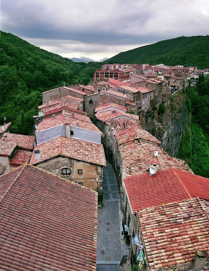 Castellfollit de la Roca位於50公尺高的玄武岩之上,一公尺左右的狹長形懸崖,看起來只能容納兩排房子,但是經過一百多年來的發展與生活,緊緊相依的房子就像不肯say goodbye的居民一樣,硬是在這不到一平方公里的土地上,塞入了一千多人。看似擁擠又帶點高度恐懼的小鎮,卻又十分安然自得佇立於懸崖邊,加上附近的 Garrotxa火山自然景觀,使得Castellfollit de la Roca成為眾多旅遊愛好者必來之地。說到這......趁歐元貶值去趟西班牙,好像是個不錯的主意耶!