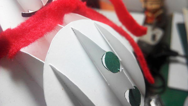眼睛部分,都直接往後凹折90度即可。帽子部分如上圖,將毛球虛線部分切開,兩兩互嵌即可。