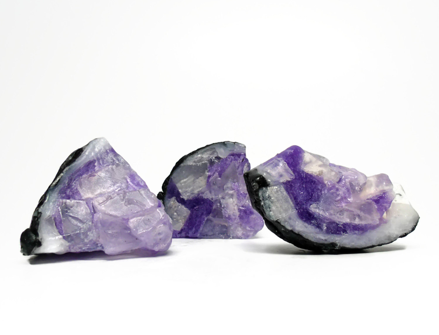 在網路商店平台Etsy上販售手工肥皂的Rock Hound Soap,就推出了和水晶或是水晶晶洞幾乎一模模一樣樣的手工肥皂,包括黃水晶、紫水晶、碧璽、石灰等等。乍看之下就像是硬梆梆的石頭,沒想到,卻是碰到水、搓個兩下就會起泡泡的肥皂,反差之大,一整個跌破大家眼鏡。