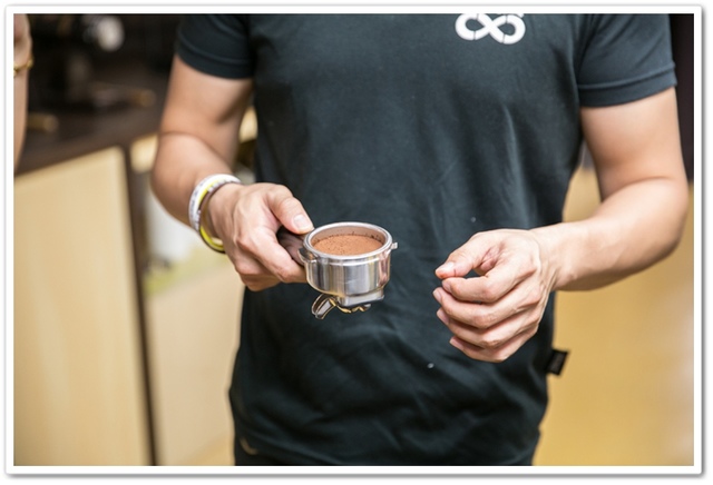 將 9 分滿的咖啡粉用刀手敲一敲,如果太滿用手將多餘的咖啡粉拍掉