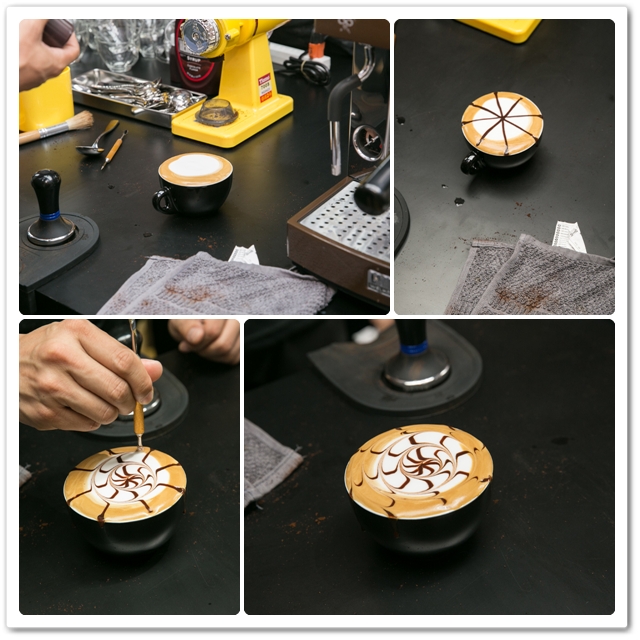 大約在杯子2/3滿的時候,用湯匙將奶泡刮到中間。 這時老師要教畫花囉!這兩款畫花看起來很複雜, 但是知道做法後發現超容易上手,而且畫起來超有成就感的。 這款是先用巧克力醬畫米字,然後用道具尖端畫圓,這樣就完成了。