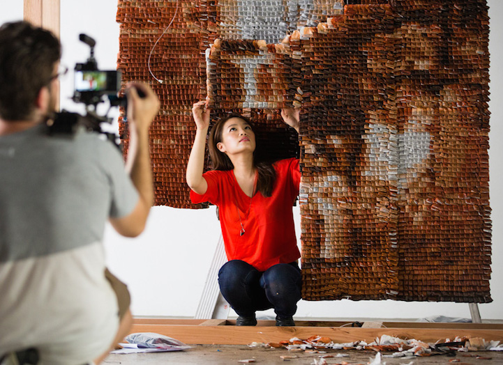 這麼大幅的作品,創作過程之繁複可想而知。康怡先將茶包放入熱水中,依照不同溫度和水量,浸泡出10種不同的色澤,並搭配食用色素染出較深的色澤。之後將茶包釘在鐵絲網上,依照茶包的色澤以及所欲描繪的輪廓、線條,一一懸掛於木架之上,總共耗費了2個月才完成。