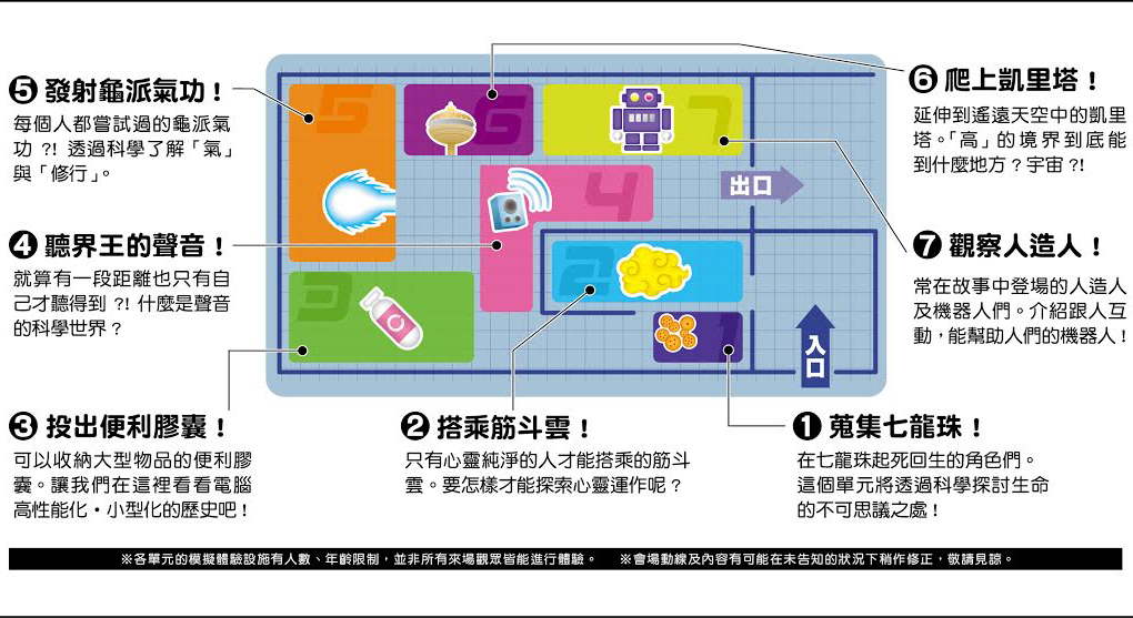以故事中登場的特殊招式及物品做為主題,從生命科學、工學及宇宙科學等多種角度解析探討,現場藉由高科技模擬裝置,不僅可體驗發射龜派氣功的威力,還能一圓乘坐筋斗雲的夢想,小朋友透過參與學習方式,感受七龍珠神奇的世界。