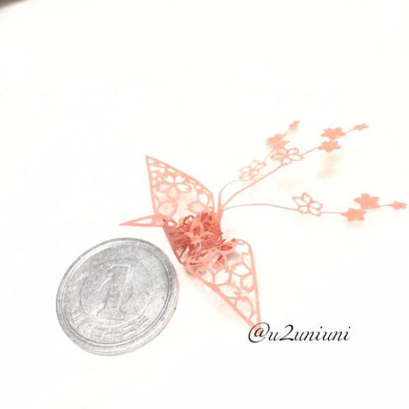Uni 在他的 Twitter 帳戶中,po出一系列的紙鶴照片,有些紙鶴拖著長長的尾巴,在空氣中留下一抹美麗的身影,有些紙鶴的翅膀上,因著風格各異的鏤空圖案,而變幻出萬種風情。有些紙鶴則僅有1圓日幣銅板(約22公厘)的大小,令人驚嘆於他的眼明手巧。