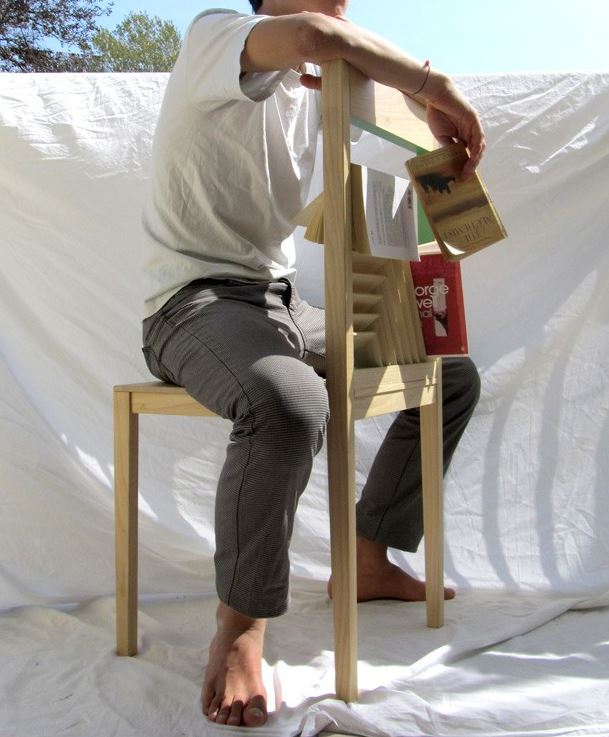 設計師巧妙的運用鏡面所產生的倒影塑造家具的外形,像是椅背上漸層式的木框,乍看之下,令人分不清究竟這是椅子中的一部分,還是鏡子放在椅子上所產生的倒影;壁燈則是透過有如扇面打開的木條,搭配放置於上的兩條LED燈條,創造出燈條在鏡面上移動的燈光效果;而當把鏡子斜靠在書櫃上,反射出來的影像,恰好就是 Narcissus Library 上不對稱的書架框。