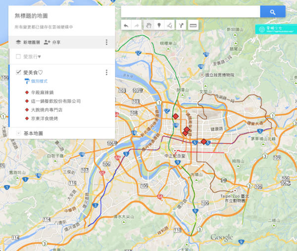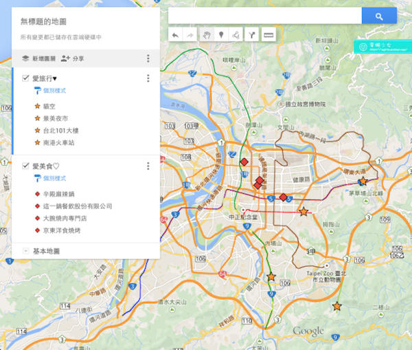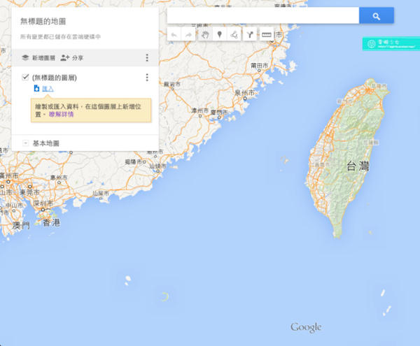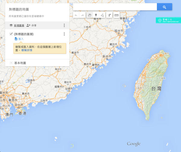 接下來可以點選「新增圖層」,而圖層是什麼意思呢?可以想像成幫地圖分類,可以美食、旅遊景點各一個分類,這樣這張地圖就變成有點像是旅行日誌的感覺。