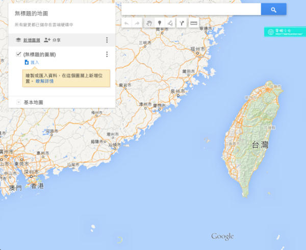 匯出之後,要怎麼匯入呢?很簡單,開啟一張新的地圖,點選「匯入」,上傳完匯出的檔案之後,就會出現之前設定的地圖囉!