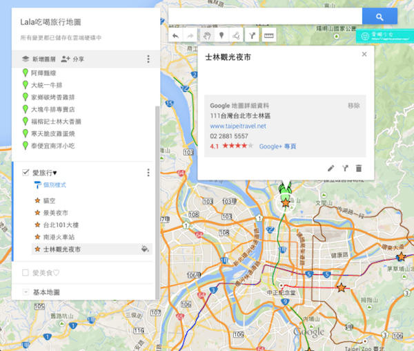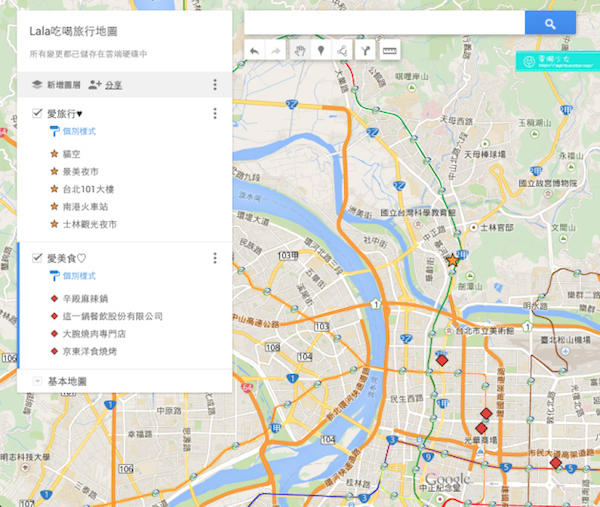「圖層」除了可以輕鬆分類之外,還可以使用勾選的功能,像是在地圖上只想顯示哪個圖層只要打勾就會出現,取消打勾就會隱藏,像上圖所示範的就可以清楚看到旅遊景點距離餐廳的距離,真的相當方便又清楚明瞭!