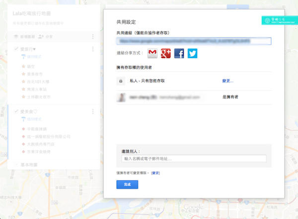 製作好地圖之後使用「分享」的功能就可以把自己的地圖分享給朋友,如果和朋友一起旅行,利用這個功能就能和朋友一起共享與編輯地圖。