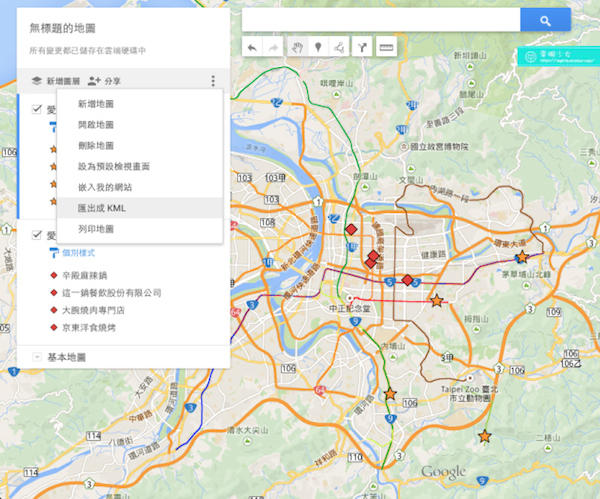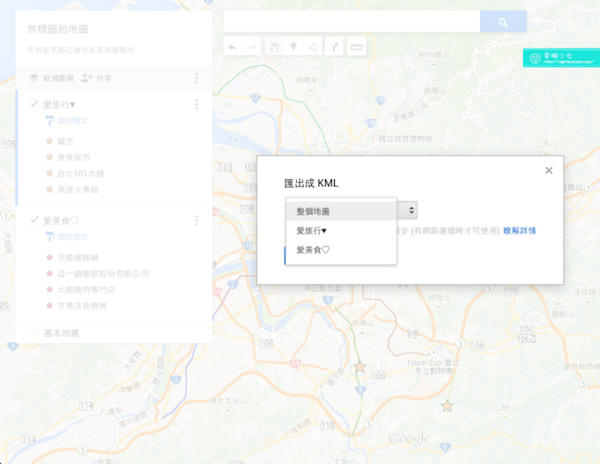 另外還要教大家一個功能,就是匯出自己的地圖資料。只要點選三個地標,接著選點「匯出成KML」,可以選擇要匯出整張地圖或是只選擇其中一個圖層。