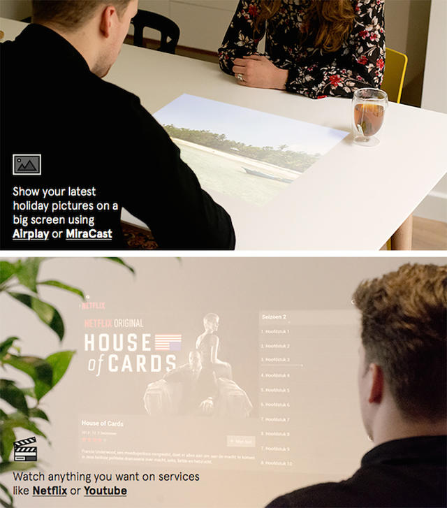這款投影燈可以直接安裝在現有的燈座上,而且本身就具有 LED 照明,不用擔心和現有的燈光配置起衝突,將傳統燈泡換置 Beam 投影燈之後,想投影的時候就投影,需要燈光的時候就開燈。此外,Beam 當代簡約的設計適合任何室內環境,不怕突兀。以後,想在家輕鬆享受大螢幕劇院不一定需要投影機囉!