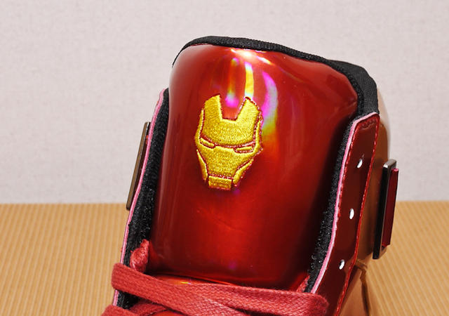 除了英雄們的標準配色之外,鞋舌處也能看到該英雄的個人標誌,「鋼鐵英雄高筒鞋」的個人標誌就是金黃色鋼鐵面具,另一邊則是 STAYREAL 的品牌皮標,象徵兩個品牌之間的聯名合作。