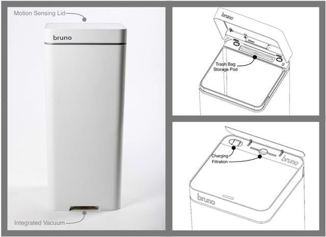 Bruno 的吸塵孔位於垃圾桶底部,約略是一般垃圾桶踏板的位置,以18瓦的電池發電,充飽一次電可以使用30天。使用者只要用掃把把垃圾掃到吸塵孔前,垃圾桶就會自動感應,透過管子將垃圾吸入垃圾袋中,省去提畚箕倒垃圾的力氣,也不會揚起灰塵。