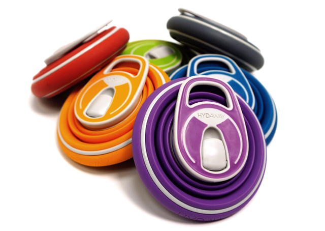伸縮式水瓶 HYDAWAY 以食品級矽膠製成,也有美國 BPA free 認證。展開可成兩種容量,只拉開上半部是 4 吋高的350ml,全部展開則是 6 吋高的 600ml,大人小孩都適用。
