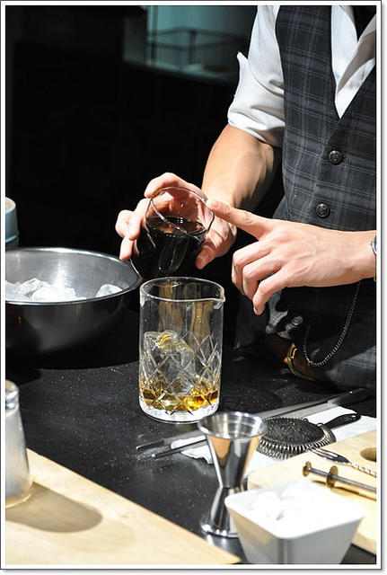 調雞尾酒很有一項很重要的器具,就是量杯,一邊是 30 ml,一邊是 15 ml,調雞尾酒最重要的就是倒進去的飲品比例。