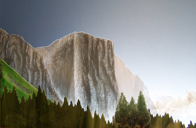 舉世聞名、景色優美的優勝美地,透過玻璃顏料反繪以及碎玻璃的手法,將樹木的鬱鬱蒼蒼展現得淋漓盡致,特別是針葉樹樹葉的部分,完美的模擬出帶點粗糙、微刺的觸感。