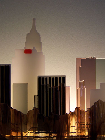 從中央公園向市中心望去,幾乎被建築物佔滿了的天際線,考驗著藝術家如何呈現這擁擠又不過度雜亂的建築層次,和快節奏生活的忙碌感。相形之下,公園中的樹木似乎隱匿於林立的高樓之間,成了配角。藏在基座下的燈光,同樣可以調整出白天和黑夜兩種景致,但要說到讓人印象深刻的部份,似乎還是照片中微暗的黃昏景致了!