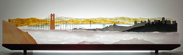 藝術家以玻璃顏料、碎玻璃和噴砂手法,描繪出被迷霧環繞的舊金山金門大橋,只剩下橘紅色的鋼索和橋塔仍清晰可見,在舊金山市的天際線、奧克蘭海灣大橋和奧克蘭山丘的陪襯下,充滿迷濛之美。