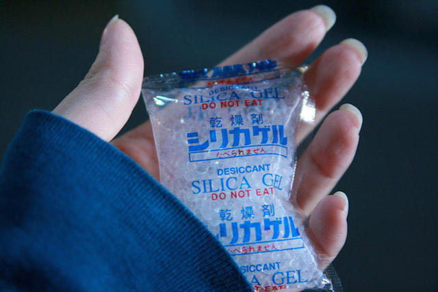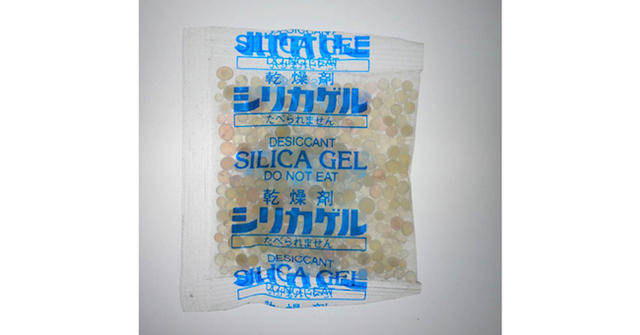 又稱矽膠乾燥劑,雖然效果沒有氧化鈣那麼夠力,溫和的它常用於藥物及電子機械中,一般加工後為透明無色的小圓粒,但為了更好判別,會添加入氧化鈷,視覺為藍色,吸溼後變化為粉紅色,直接用肉眼就能判斷吸濕與否。雖然矽膠乾燥劑可以經過烘乾後再度使用,但依照台灣這種高濕氣及高溫環境,我們還是丟棄不用是最保險的方法。