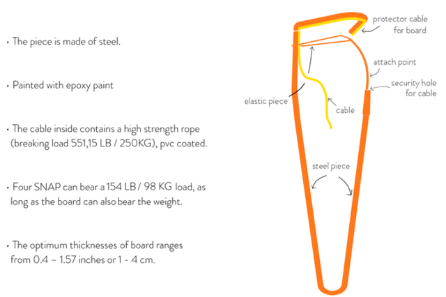 SNAP 的結構圖如上,四隻桌腳平均承重量為 98 公斤,桌板厚度從 1~4公分的範圍內都吃得進去,扮演重要角色的彈力繩索也有 250 公斤的拉力,在這些條件之下,應該能應付大部分的需求了,如果你對於自組桌子躍躍欲試,卻還遲遲沒有入手任何相關產品,我們認為,這是進場的好時機了XD