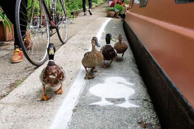 最近當地文化組織Canal & River Trust與政府合作,將部分的運河旁畫上了這麼一條鴨行道,希望不管是腳踏車騎士還是行人都可以注意腳下的可愛鴨子們,讓牠們除了能在河道裡自在悠游,上了陸地也能安心的逛大街,其目的當然是以愛護動物為出發點,與鴨子們共享空間。如果各位有機會到此拜訪,千萬記得別佔了鴨子們的鴨行道,不然可是會被呱呱呱的!
