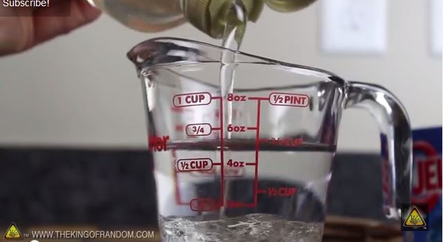 準備半杯冷開水,倒入約 1盎司的玉米糖漿,並耐心地將兩者攪拌混合,玉米糖漿的作用讓軟糖有柔軟光滑 Q 彈的觸感。