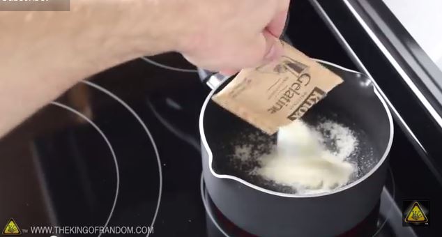 將攪拌後的玉米糖漿倒入鍋中,並加入兩包吉利丁和果凍原料粉,再次耐心地將它們統統攪拌融合。