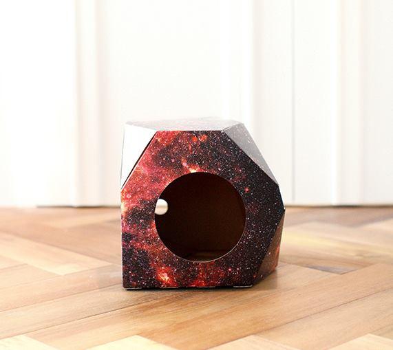 通常會因為這種因素而自己動手研發產品的設計師,最後都會爆出不小的能量,CHAOS 的貓屋有像是隕石般不規則的多邊外型,還有星雲般佈滿紅色雲霧和星體的印刷,更酷的是,其中有些星點到了晚上還會發亮,充滿宇宙的浪漫元素,讓紙貓屋不再是普通消耗品,而是連你看了都會滿心歡喜的室內裝飾品!