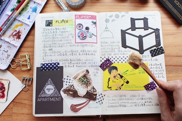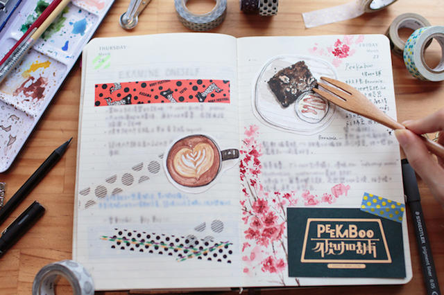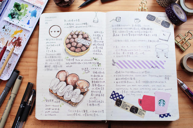 一直有寫手帳習慣,記錄著每天的生活瑣事及工作待辦事項,但是只有滿滿文字,沒有任何圖畫。開始畫手帳是 2014 年 11 月某天在咖啡店一個人工作時,突然在空白本上畫下眼前的咖啡、甜點,於是開始想為喜歡窩咖啡店和吃美味甜點的自己,在手帳上增添一點顏色和心得。